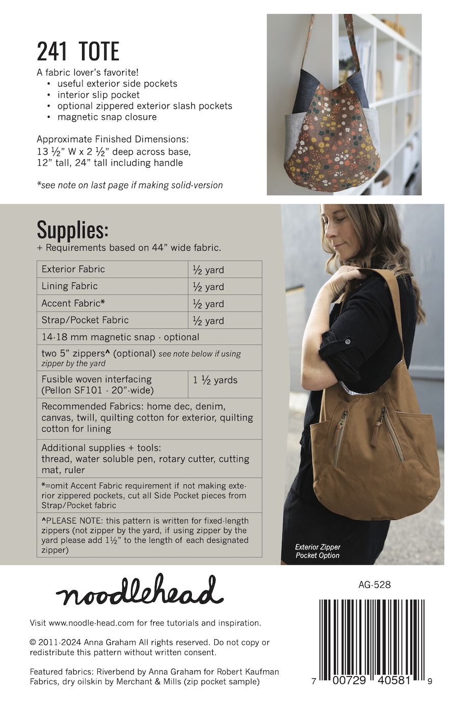 1. #About#This tote is a fabric lovers favourite! Using small cuts of fabric, you'll be able to use your favourites and still have scraps leftover. It's called the 241 because it's like two patterns in one! One version of the bag has two exterior side pockets (great for beginners), the other has two exterior zippered pockets (for those who might want a bit of a challenge) Approx finished dimensions 13.5" wide, 12" tall, 24" including handle, 2.5" deep across the base).