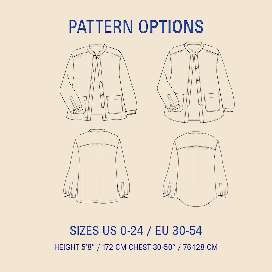 The front and back gather to the yoke, and the sleeves are cuffed. You can choose a straight or curved hemline, or skip the pockets to turn it into a shirt. The unlined body and roomy silhouette make it a satisfying, slow-sew project to enjoy every stitch.