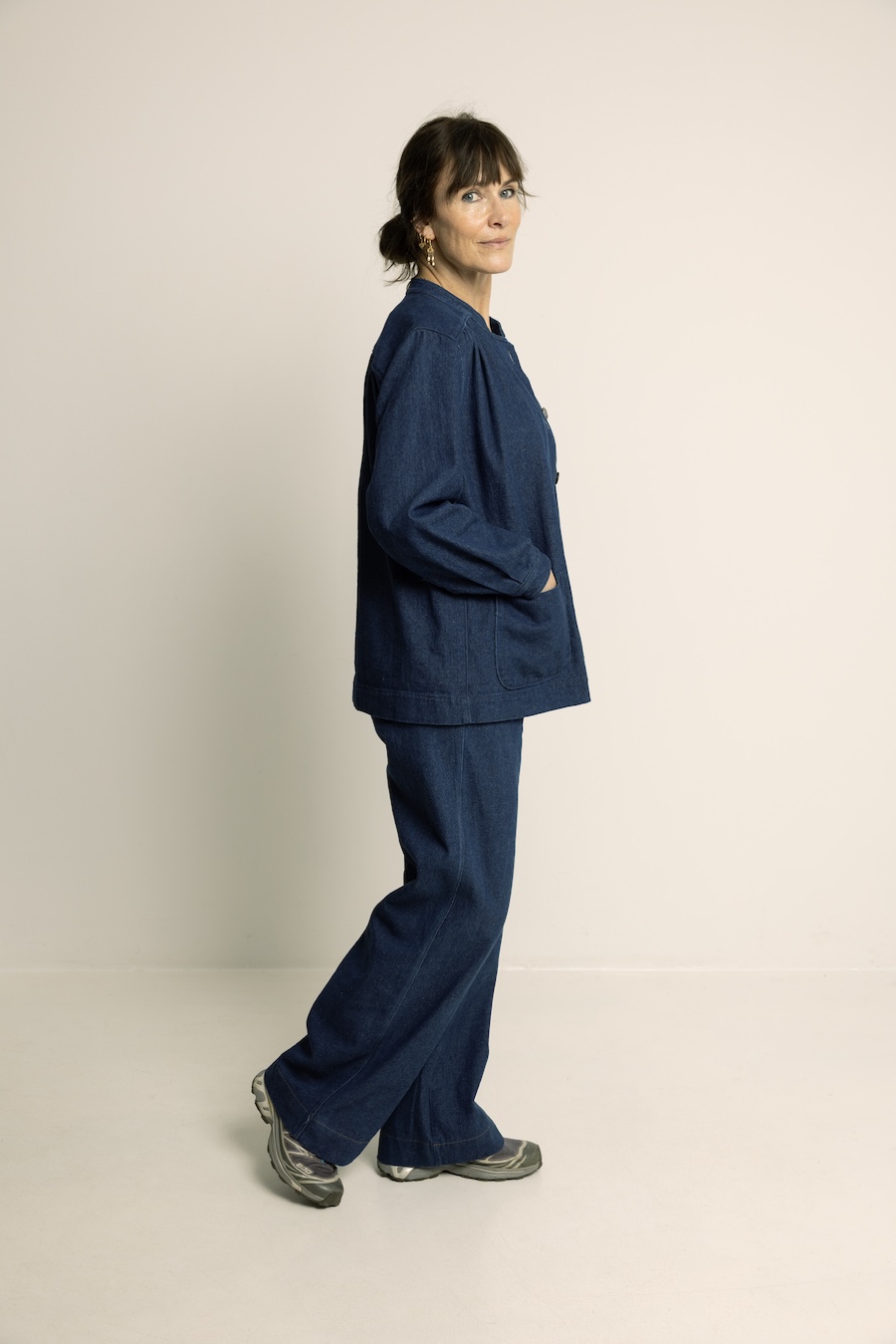 The Artist Jacket Sewing Pattern is a relaxed, functional workwear-inspired piece with dropped shoulders, a front button placket, large patch pockets, and a minimalistic banded collar.