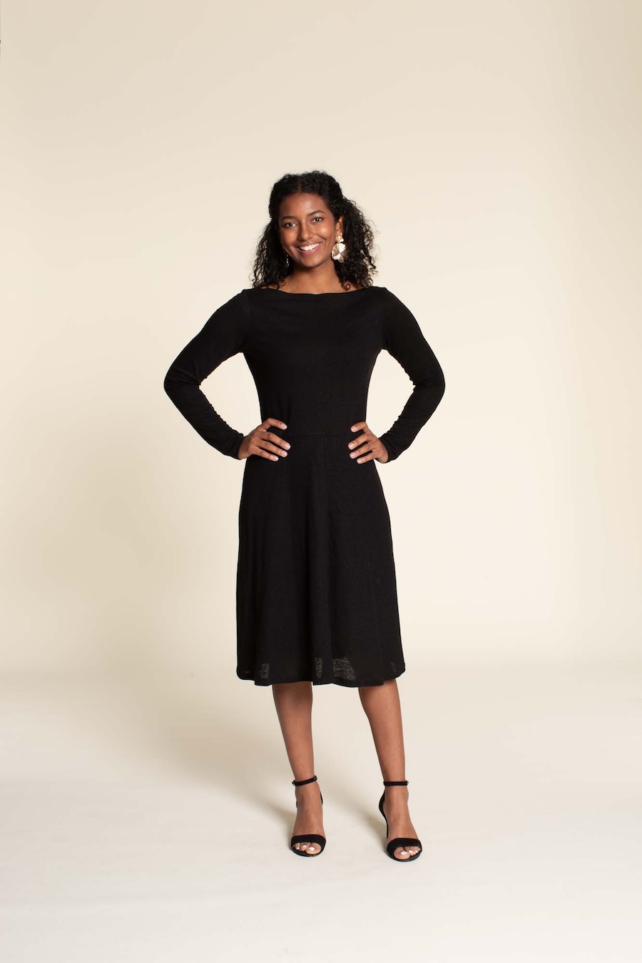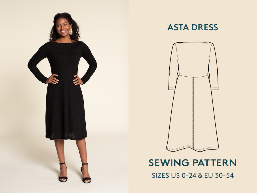 1. #About#Asta jersey dress has a fitted body, slightly flared four-gore skirt with patch pockets. Choose from boat- or turtle neckline. Choose from five sleeve lengths. US 0-16 & EU 30-46. Height 5'8" 172 cm