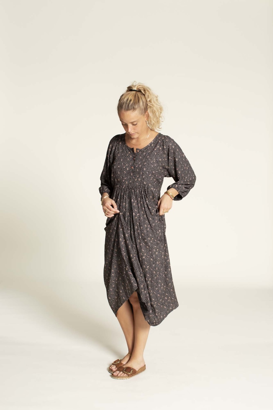 Designed with versatility in mind, Balka offers endless possibilities. The dress's skirt boasts numerous gathers at the waist, adding volume and movement to your ensemble. Complete with side seam pockets for practicality and convenience; this pattern seamlessly combines style and functionality.