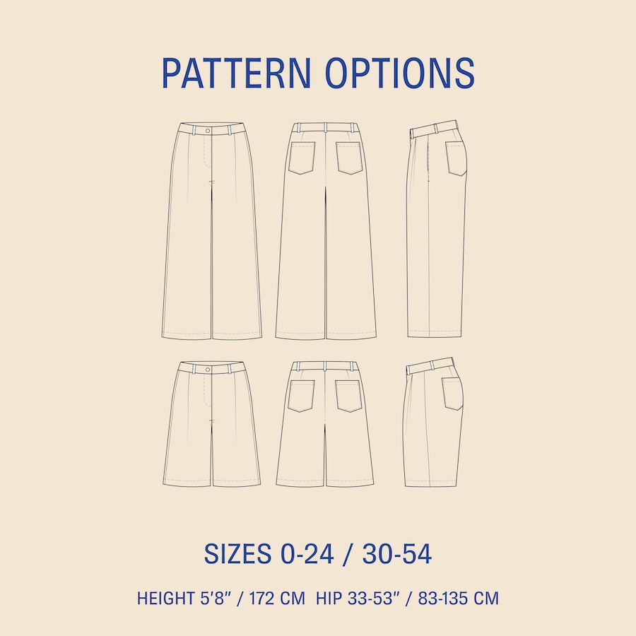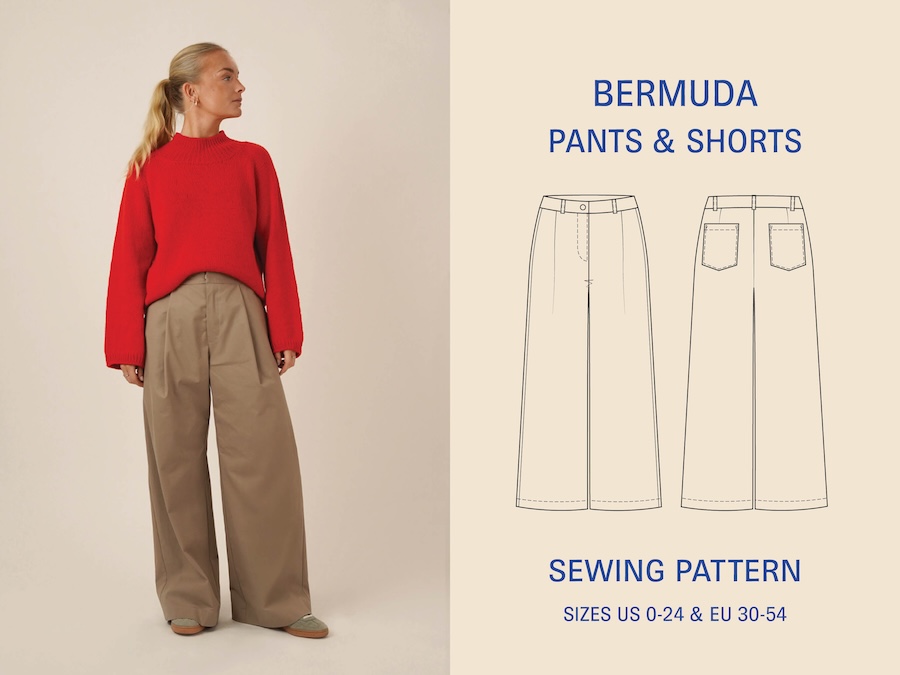 The Bermuda Pants and Shorts sewing pattern from Wardrobe By Me is a relaxed and comfortable design suitable for casual wear. It features a contoured waistband, deep front pleats, a front fly with zipper, inseam side pockets, and back patch pockets for both the pants and shorts versions.
