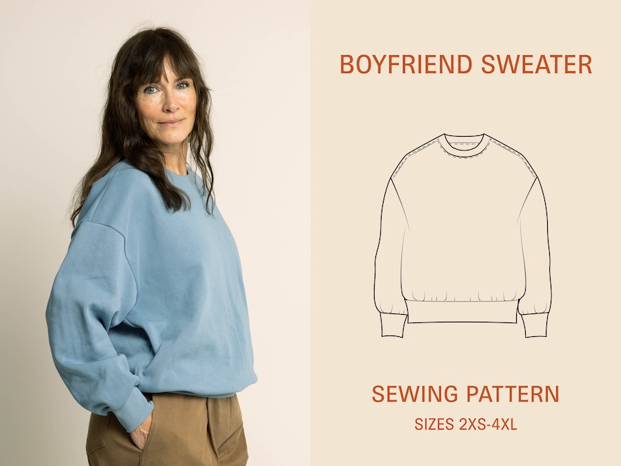 The Boyfriend Sweater sewing pattern is the epitome of comfort and style. This casual sweater boasts a cozy oversized fit with generously sized sleeves and exaggerated dropped shoulders, enhancing its laid-back vibe. Both the sleeves and hem feature ribbed bands, providing a structured finish. Suitable for both men and women, the pattern includes sizes ranging from 2XS to 4XL.