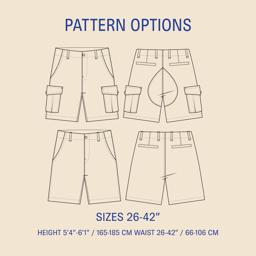 1. #About#Men's Cargo Shorts sewing pattern has pleated side pockets, back welt pockets, a front fly with zipper, side pockets, six belt loops, faced waistline, and back reinforcement. This traditional cargo short has a 9½in / 24 cm inseam.