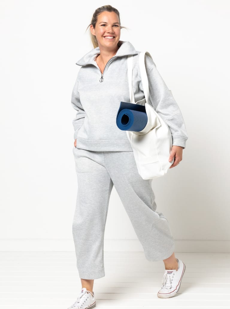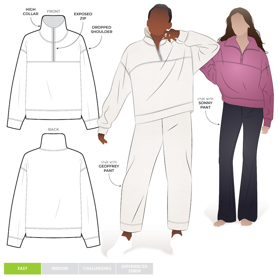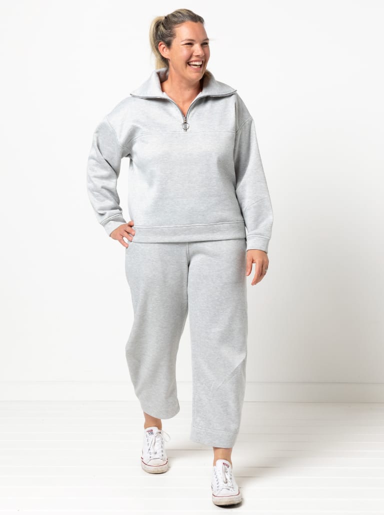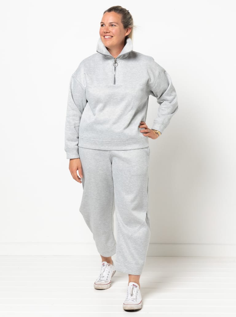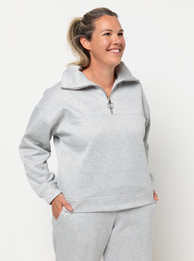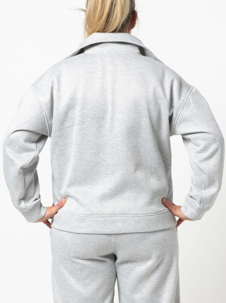The Cassia Knit Top is a zip-front, long-sleeved windcheater-style knit top pattern with a collar and dropped shoulder line. It features a front yoke seam, deep armholes and a relaxed, sporty shape that finishes at high hip length.