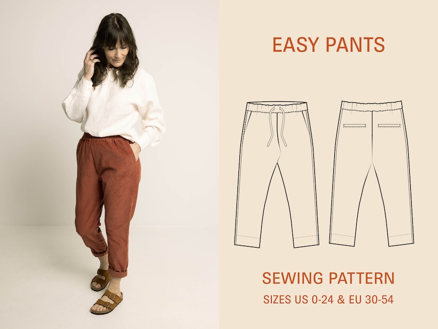 1. #About#The Easy pants sewing pattern is a classic pair of pull-up pants for woven fabric, with elastic waistline, side pockets, optional back welt pockets, slim leg, and cuffed hem.