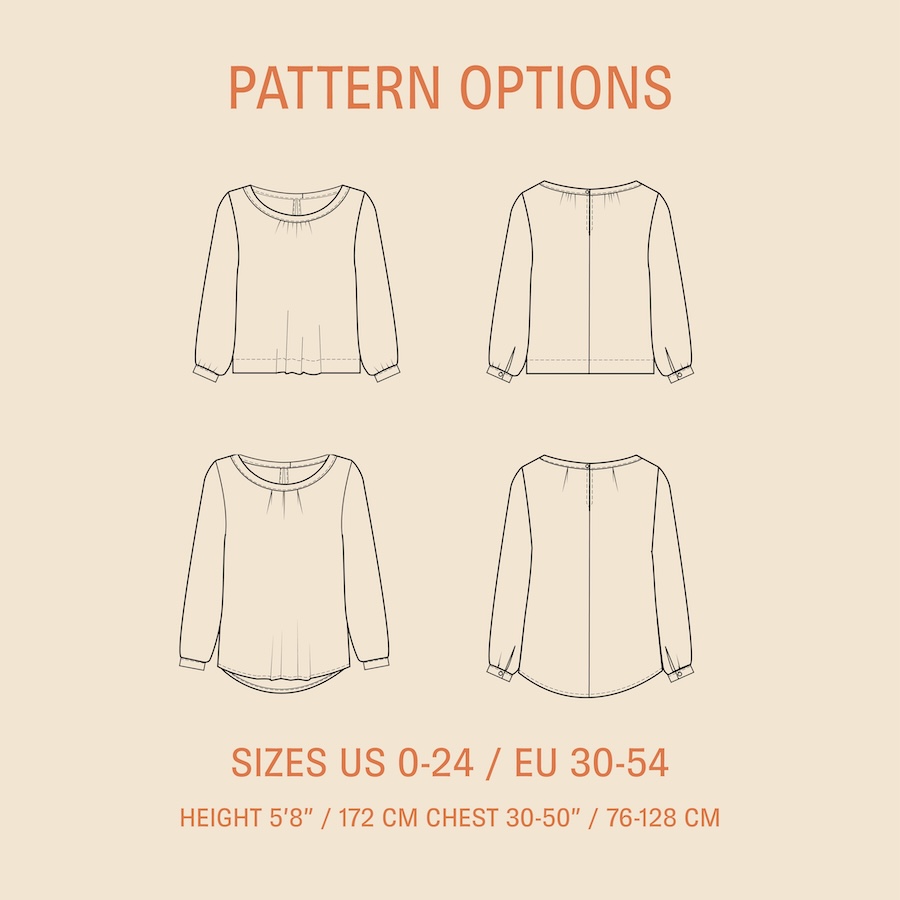 1. #About#Esther Blouse sewing pattern is a feminine top designed for woven fabric. The blouse has pleats (A) or gathers (B) at the neckline. The back neckline has a button and slit. The sleeve is gathered or pleated to the cuff. The body and sleeves have two length options.