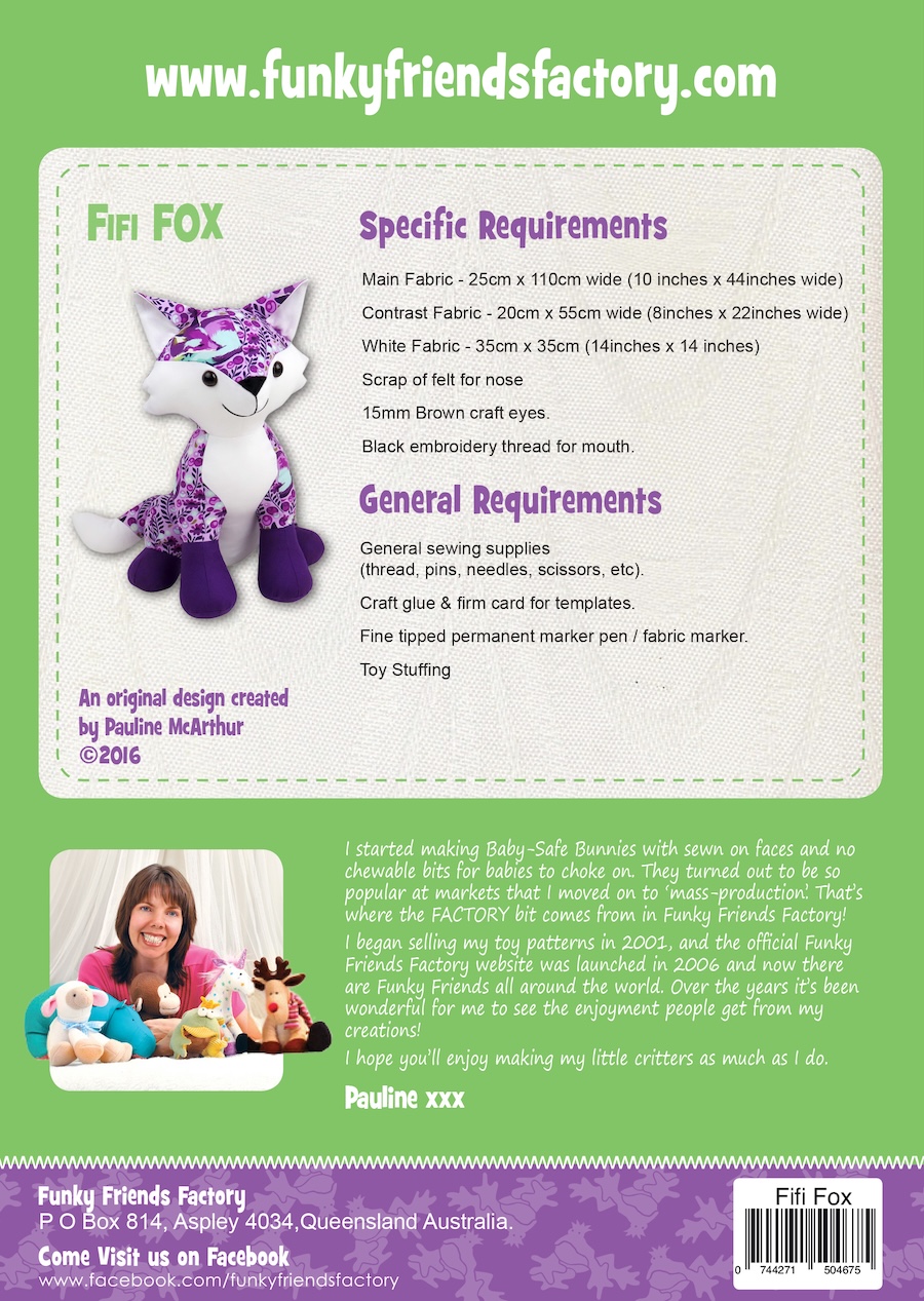 Fifi Fox is a foxy little lady who loves prancing around in the sunshine. She looks gorgeous in all sorts of fabrics, so there’s no need to stick with "quick brown fox”! Use fun prints or soft textures to give her personality and charm.