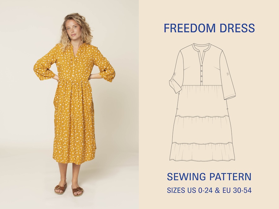 1. #About#The Freedom dress sewing pattern is a loose, flowy, tiered dress with statement sleeves and a skirt with two or three tiers. Make several different looks from this pattern. The top is cut like a shirt, and the ruffled layers ascend from the waist seam. The freedom dress is perfect for drapey woven fabrics.