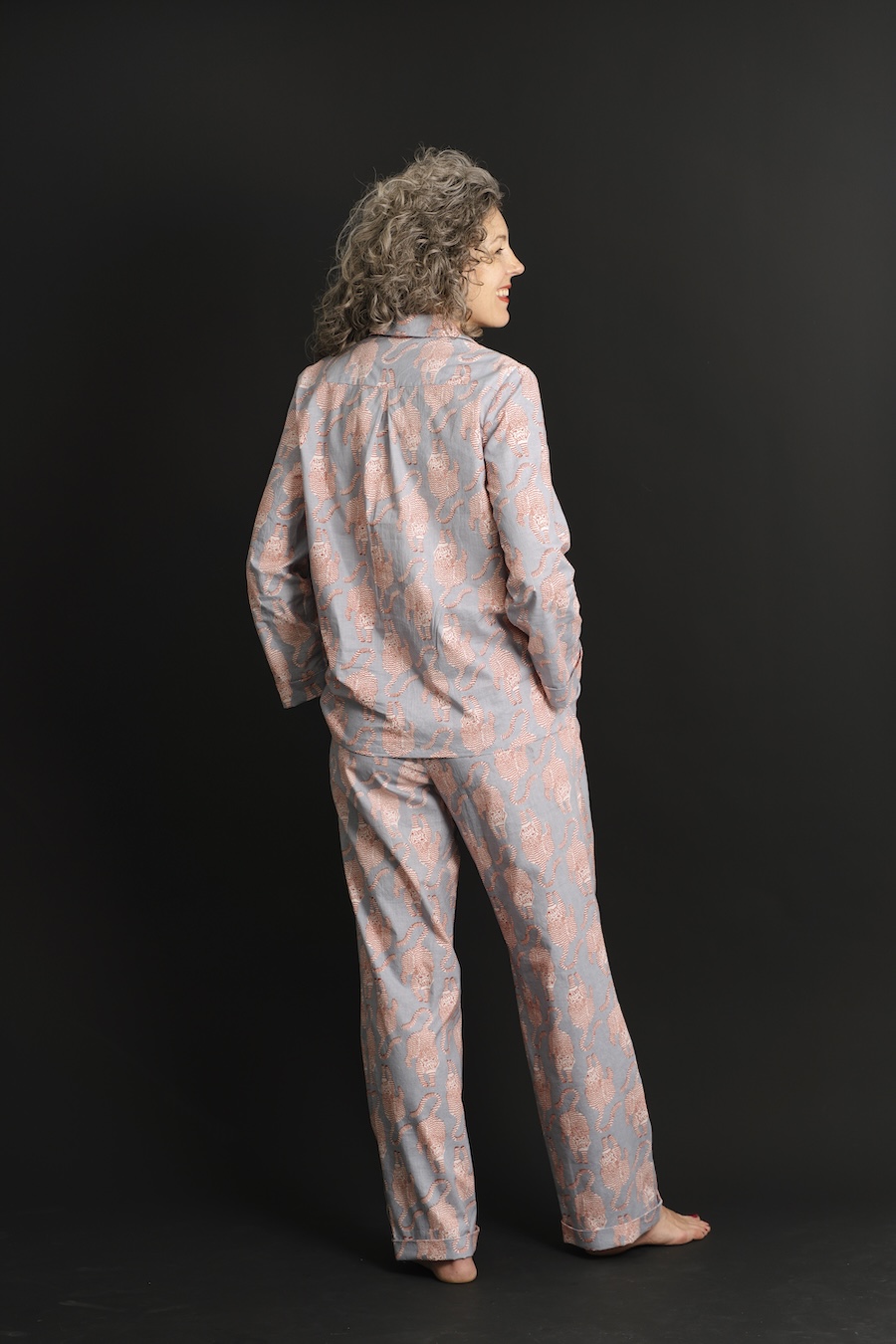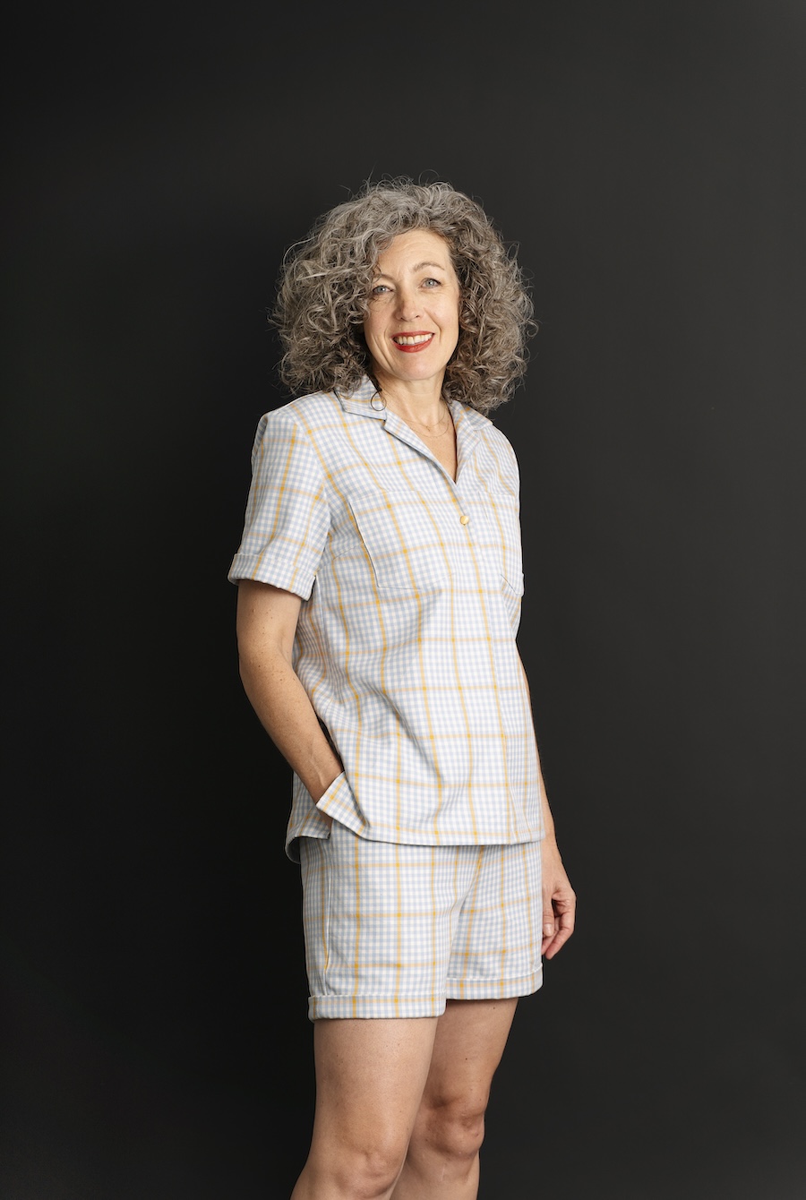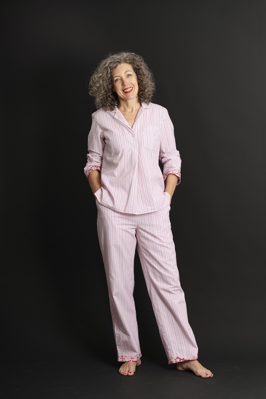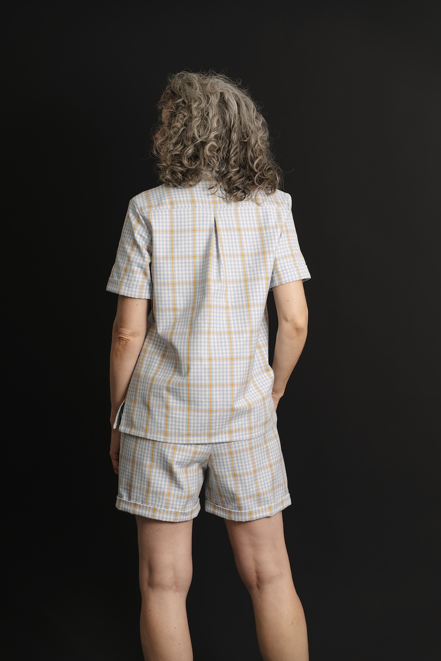 These popover-style pajamas look a lot like the classic button-down version, but the buttons stop halfway down so the top stays closed without the uncomfortable buttons. The top features a convertible camp collar, two front pockets, back yoke with inverted box pleat, side vents, and cup sizes. Choose long sleeves (View A) or short sleeves (View B). The bottoms have front pockets, an elastic waist, and can be sewn either as trousers (View A) or shorts (View B), both with cuffed hems.