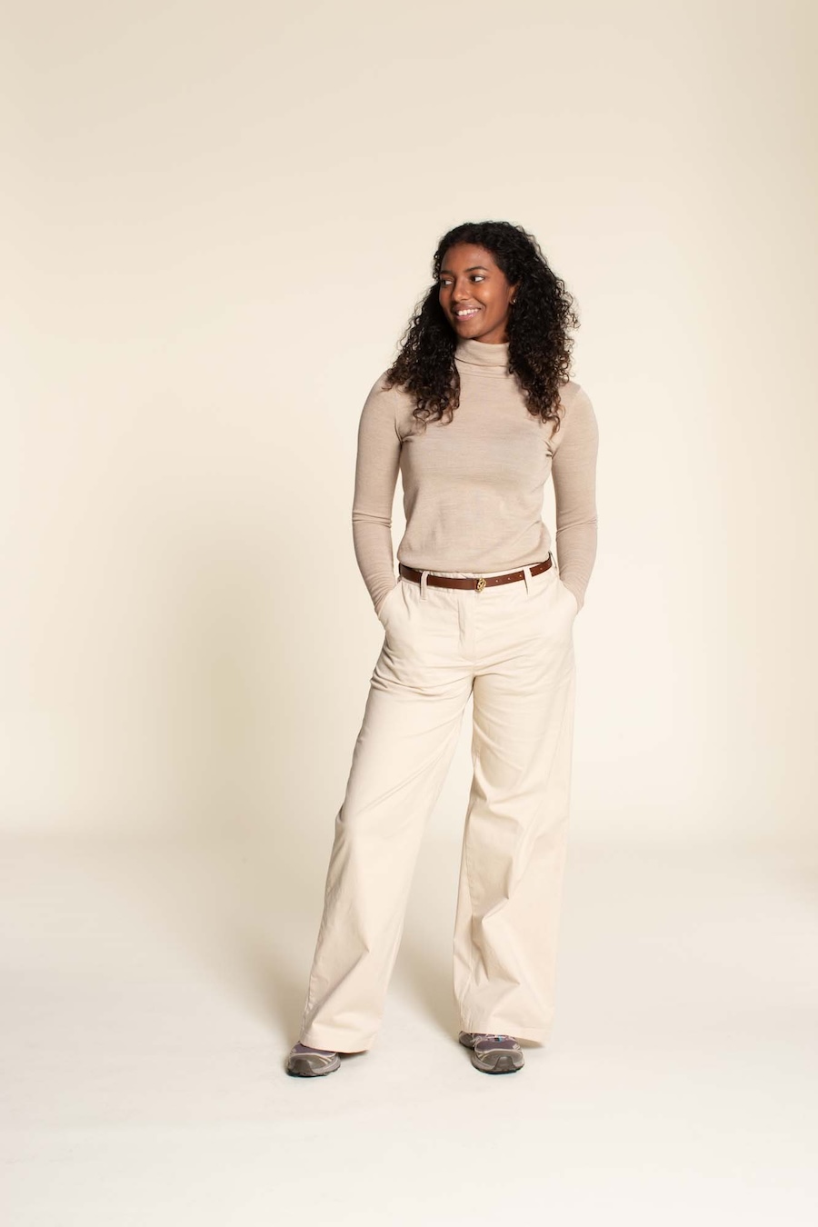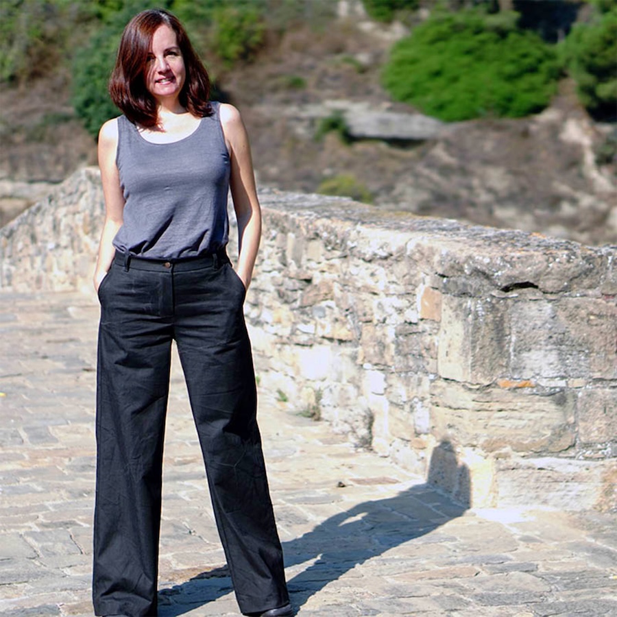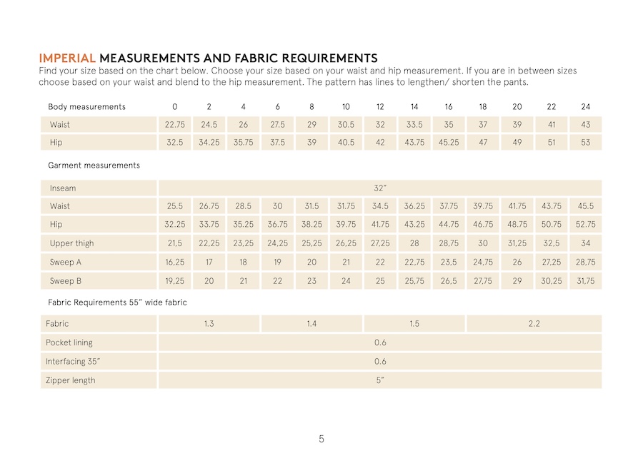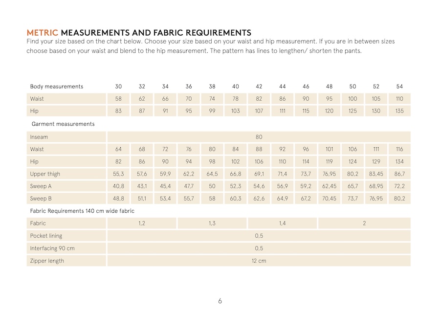 The Hepburn pant sewing pattern is a high waisted pair of pants with back welt pockets, front fly with zipper, side pockets, and waistband with five belt loops. Choose between two leg sweep options; A is 19,5” / 50 cm and sweep B is 23” / 58 cm (in size 8 / 38).