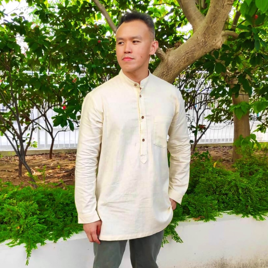 The Men's Classic Tunic sewing pattern is a pull-on tunic with a banded collar and four-button front placket. The double yoke with a center-back box pleat creates a comfortable, relaxed fit. This pattern can be made with two types of sleeves and a classic curved hem or a long straight body with side slits at the hem.