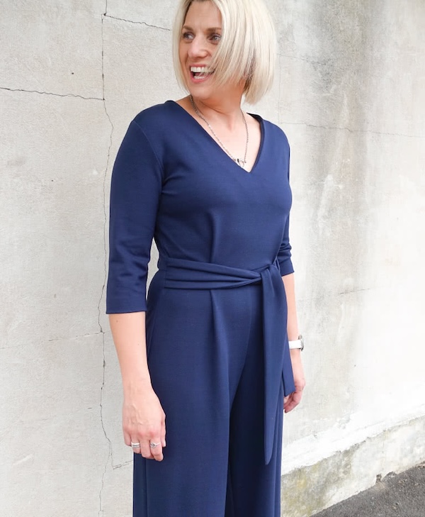 Boardroom to bar work or weekend this versatile jumpsuit pattern comes with pants or skirt and can be made with sleeves or sleeveless. This understated style has a V neck tie belt and it is fitted to a comfortable and flattering silhouette. The of the moment wide leg sits on the ankle.