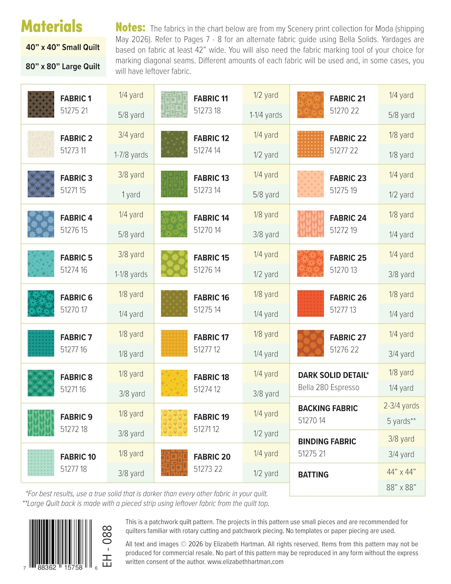 Make a 102 x 102 cm (40 x 40 in) small quilt with one of each block or a 203 x 203 cm (80 x 80 in) large quilt with four of each block.