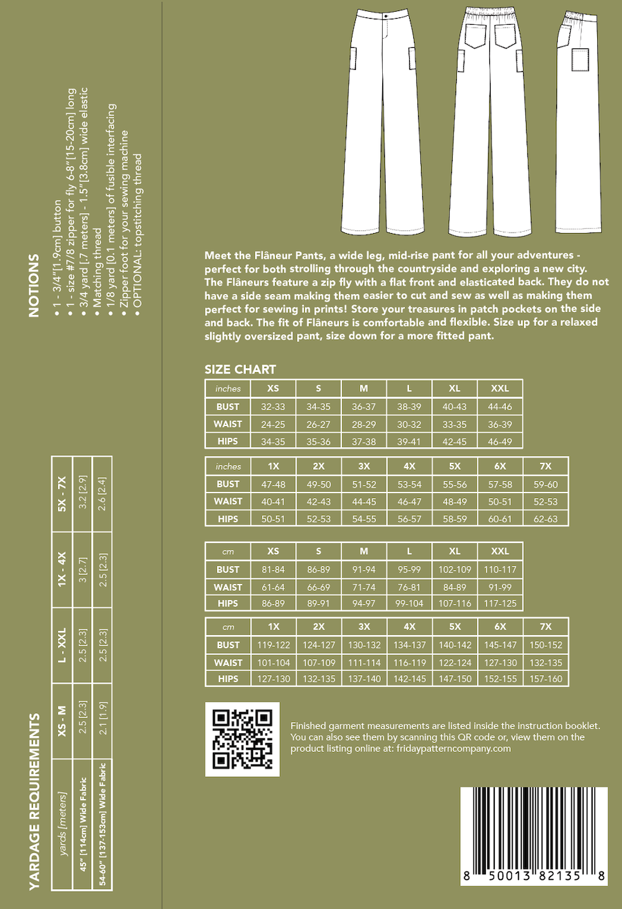 Meet the Flâneur Pants, a wide-leg, mid-rise pant for all your adventures—perfect for both strolling through the countryside and exploring a new city. The Flâneurs feature a zip fly with a flat front and elasticated back. They do not have a side seam, making them easier to cut and sew, as well as ideal for sewing with prints. Store your treasures in patch pockets on the side and back. The fit is comfortable and flexible—size up for a relaxed, slightly oversized pant or size down for a more fitted silhouette.