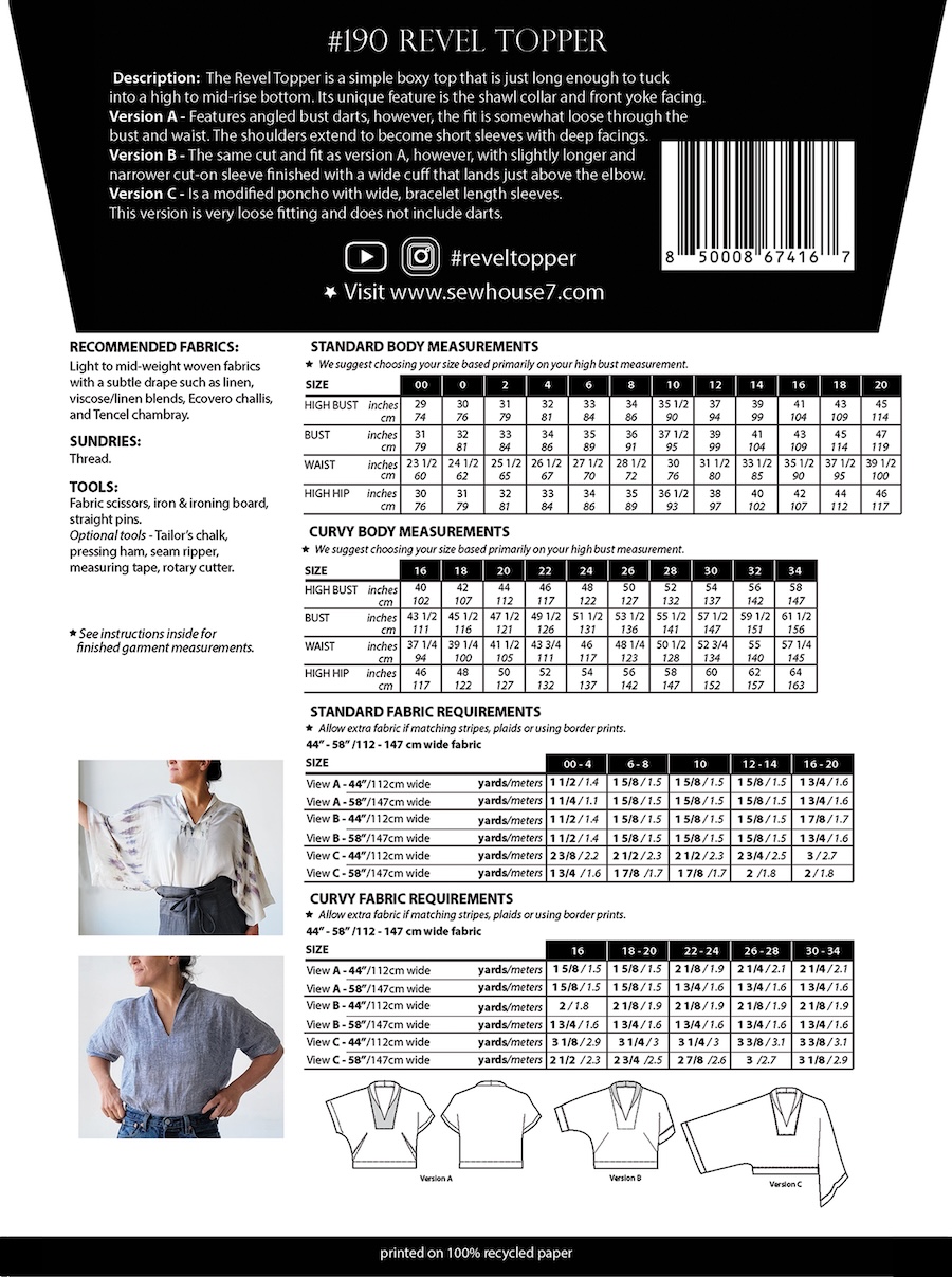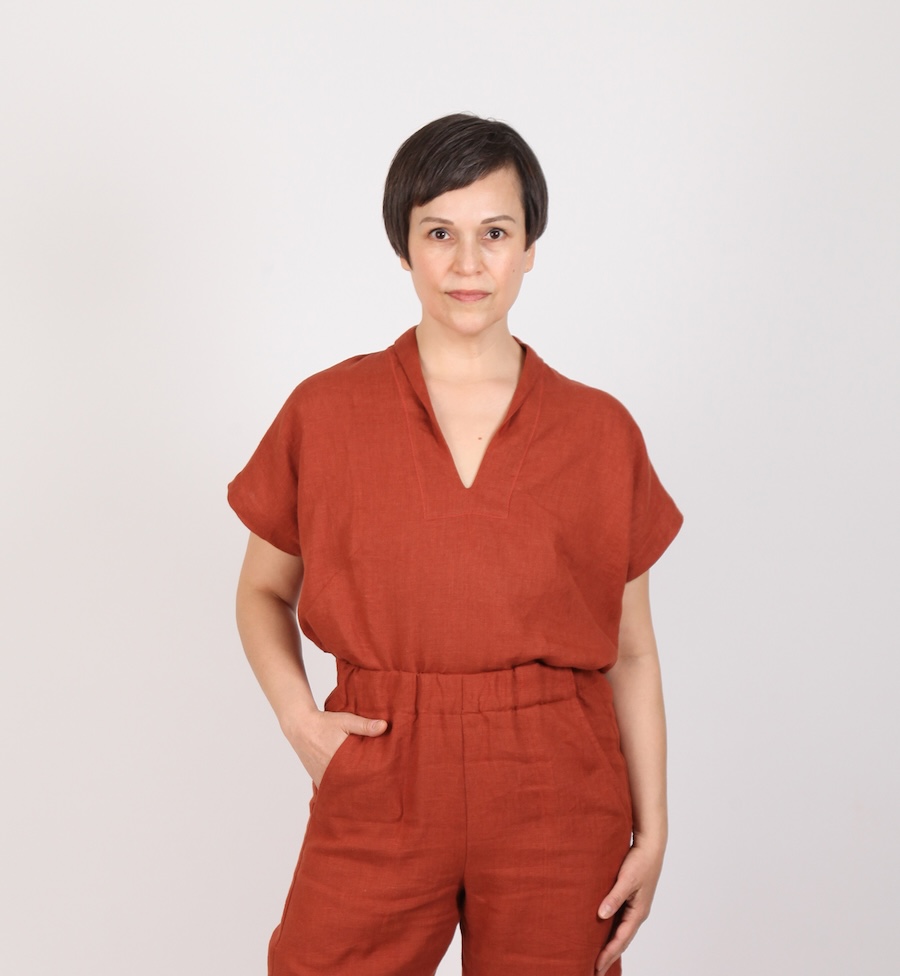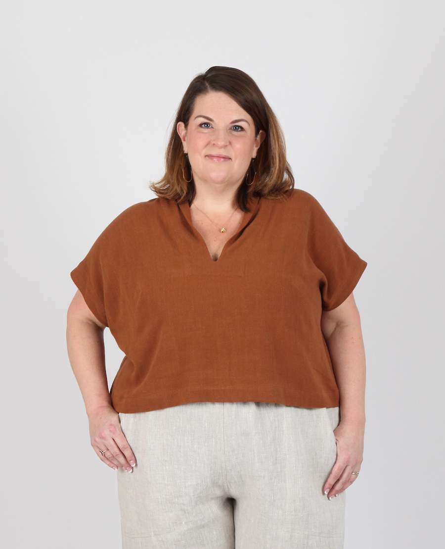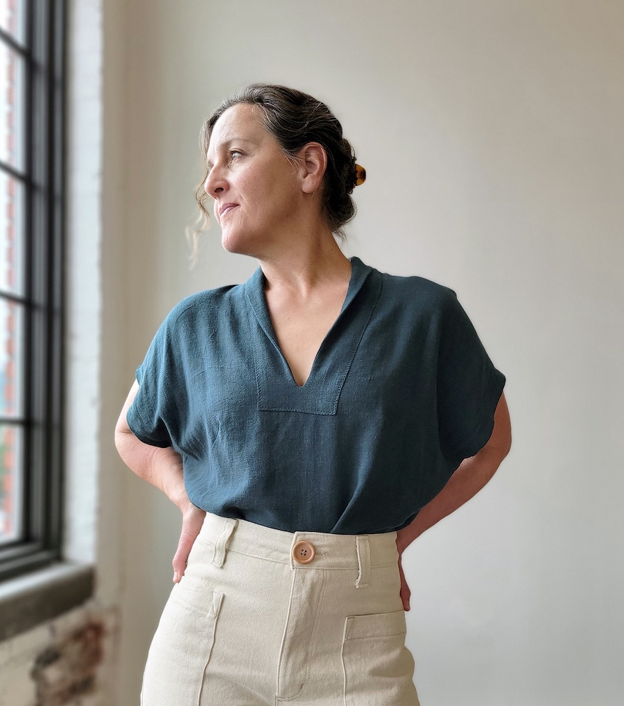 The Revel Topper is a simple boxy top that is just long enough to tuck into a high to mid-rise bottom. Its unique feature is the shawl collar and front yoke facing.