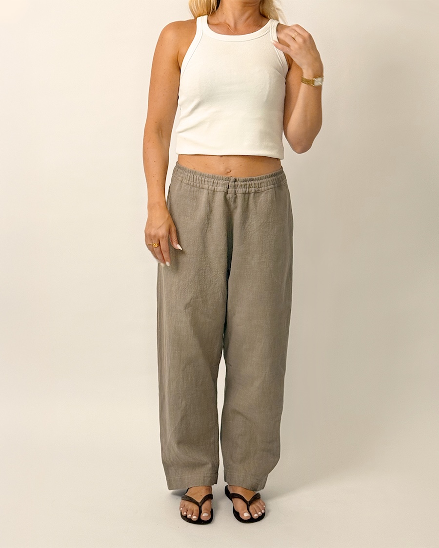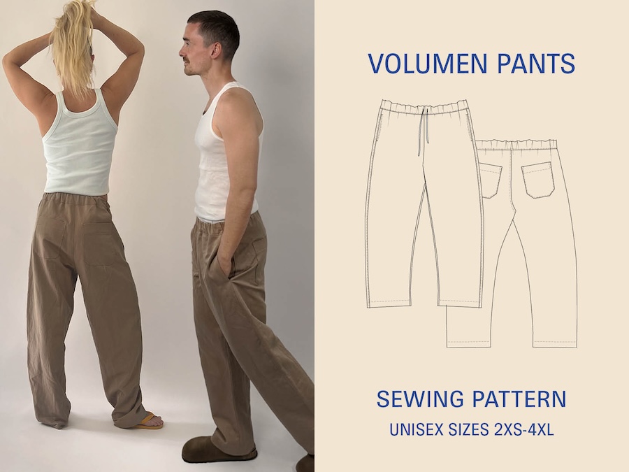 The UNISEX Volume Pants sewing pattern is a relaxed pull-on pant design for woven fabrics, featuring an elastic waistline, side inseam pockets, and back patch pockets. With a curved side seam that creates a distinctive barrel leg shape, the fit is comfortable and stylish.