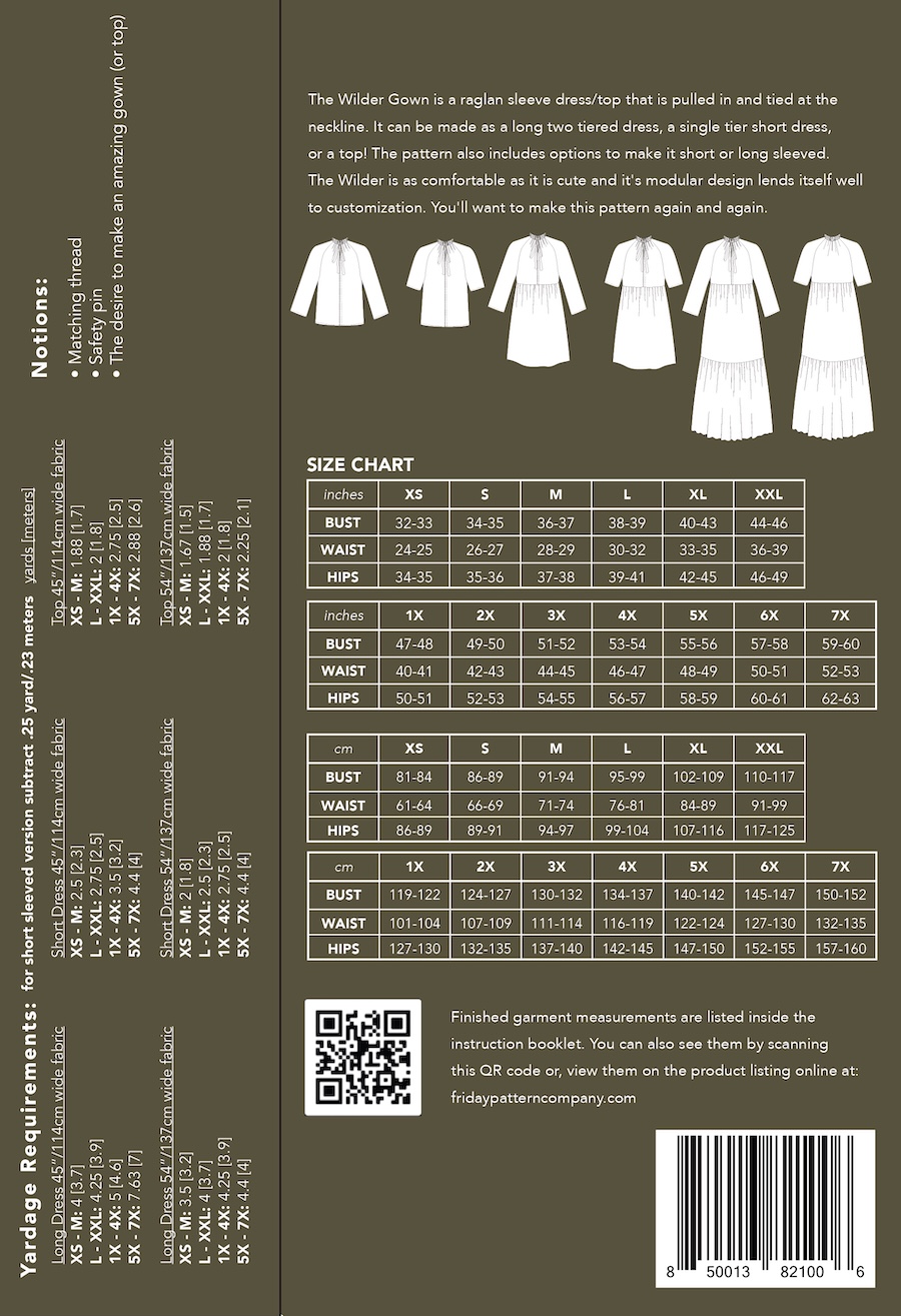 1. #About#The Wilder Gown is a loose, flowy, tiered dress that can be sewn up in a bunch of different ways! It has raglan sleeves and ties up at the neck. It is easy to sew and is perfect for drapey woven fabrics. The Wilder Gown can be made as a top or dress, long or short sleeved, with one skirt tier or two. The design is fairly modular so it is easy to customize to your vision! Sizes XS - 4X | Easy to sew | Designed for woven fabrics