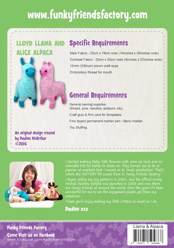 Lloyd the Llama and Alice the Alpaca are adorable cousin camelids — llamas have longer faces and ears, while alpacas have a fluffier fleece! These charming toys can be made in quilting cottons or in soft knits such as fleece or minky for a cuddly version.