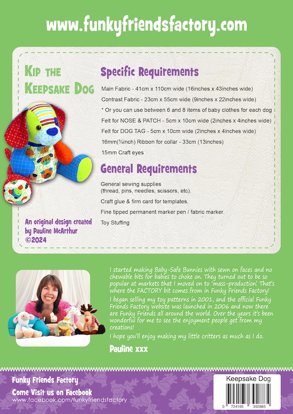 This adorable keepsake dog is specially designed for turning treasured clothing into a personalised memory toy. The large flat tummy, ears, and foot-pad pieces are perfect for adding embroidery such as names, dates or meaningful messages. With its floppy ears, rounded snout and classic doggy shape, this pattern is ideal for milestone gifts, memorial makes, and baby-clothes keepsakes.