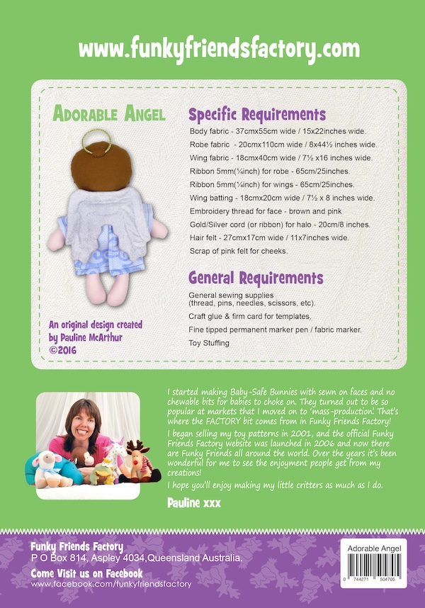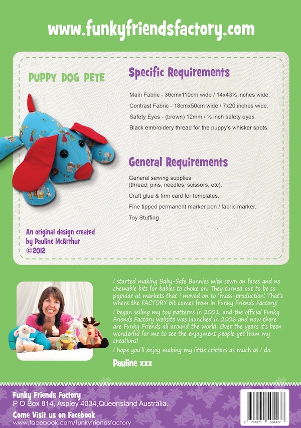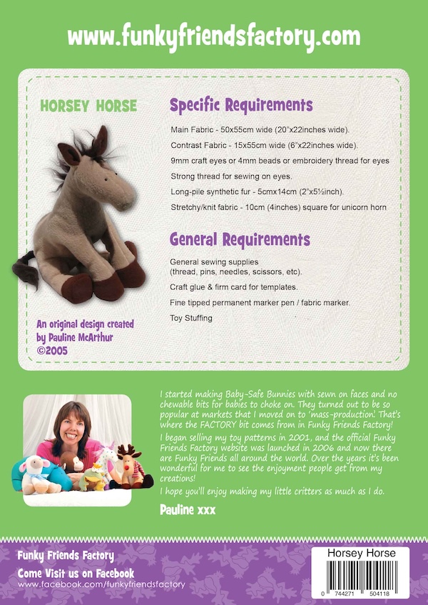 Raff is the latest addition to the "Out of Africa” range by Funky Friends Factory. He looks great in all sorts of colours and prints — if you use a bright, funky fabric you won’t need to sew on spots, but templates for giraffe-shaped spots are included.