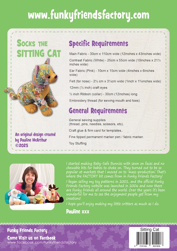 This sitting kitty is a sweet and simple cat character with a charming pose and a friendly face. Designed with smooth curves and classic cat features, it sews up beautifully in prints, plains or soft furry fabrics. A lovely project for cat lovers or anyone who wants a quick-but-cute soft toy.