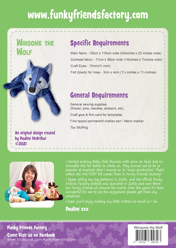 This striking wolf soft toy lies in a relaxed pose with legs out to one side, giving it a unique, expressive silhouette. With a sweet face and detailed shaping, it’s designed for confident makers ready to sew an impressive and memorable soft toy.