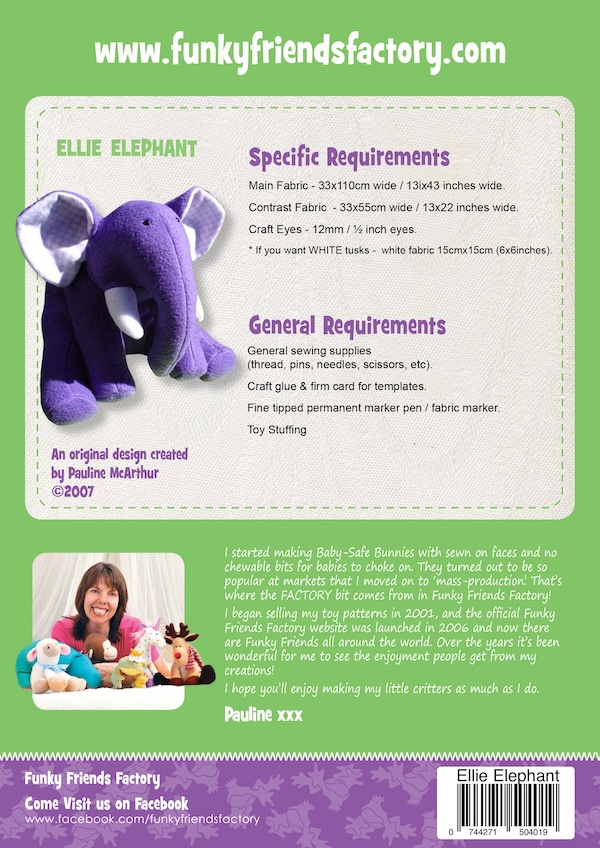 Ellie Elephant is one of the most popular patterns — especially for babies who love to grab their elephant by its trunk and drag it around the house! Make this elephant in cottons for structure or in fleece/minky for a soft cuddly version. Add texture by using satin or corduroy for the ears.