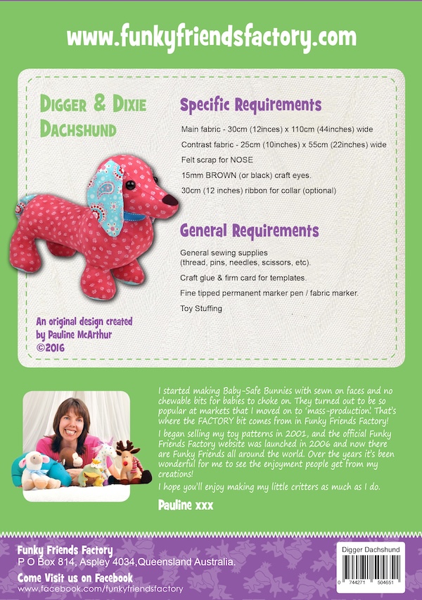Everyone loves a Dachshund! This pattern lets you sew a sweet pair of sausage-dog siblings: Dixie with her tail down, and brother Digger with his upright ‘puppy’ tail. They’re ideal for cuddling and make a fun, stylish soft toy project.