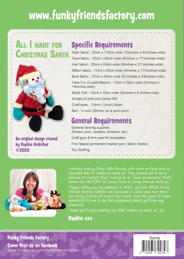 Everyone loves Santa Claus, especially when he brings you ALL you want for Christmas! Father Christmas looks great in all sorts of Christmas fabrics, not just red and green, although he was told he HAS to have green mittens! This big, huggable Santa buddy would be happy under the tree or on a shelf next to your favourite elf!