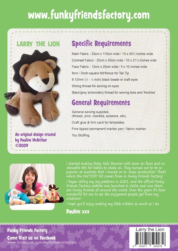 Larry the Lion is a playful, character-filled soft toy with a wonderful scruffy mane created from felt or fabric strips. His friendly face and sturdy body make him a fun project to sew, and he looks fantastic in bold prints or bright colours. A great design for showcasing textures and creating a truly personality-packed lion.