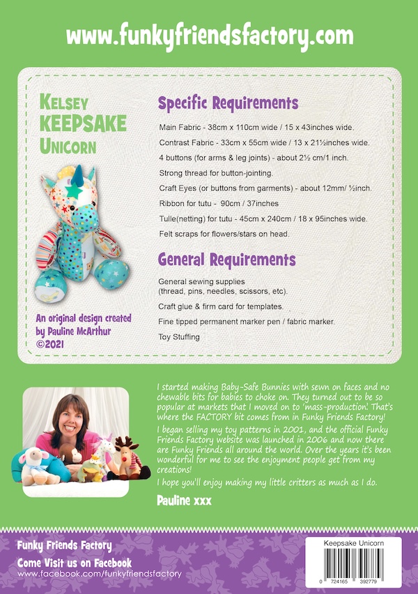 This cute unicorn is specially designed for sewing treasured keepsakes. With large flat areas perfect for adding embroidery (such as names, dates or messages), it’s ideal for turning baby clothes or special fabrics into a magical memory toy. The colourful mane, chubby body and classic unicorn horn make it a charming project for milestone gifts and memorial keepsakes.