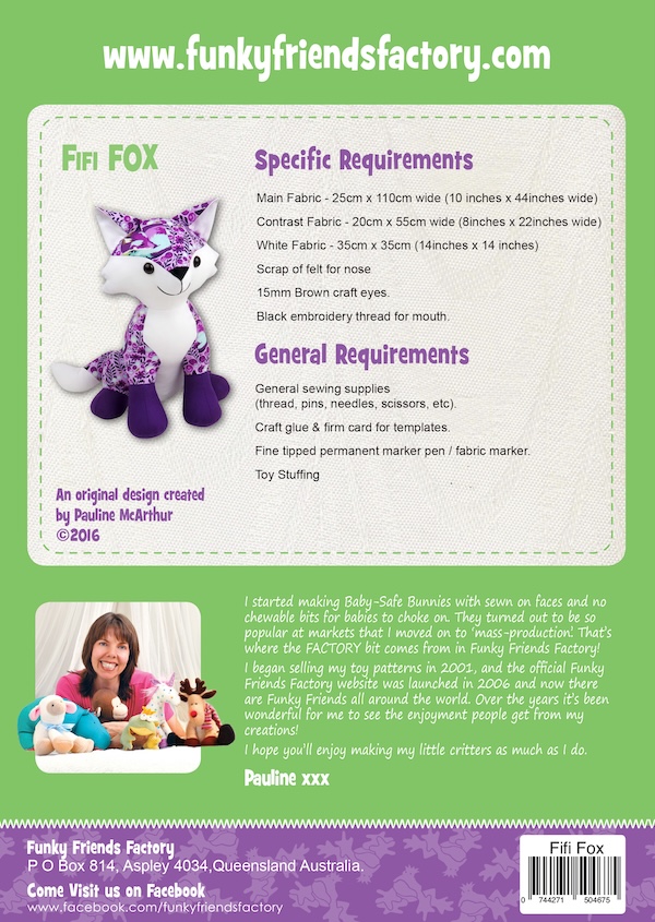 Fifi Fox is a foxy little lady who loves prancing around in the sunshine. She looks gorgeous in all sorts of fabrics, so there’s no need to stick with "quick brown fox”! Use fun prints or soft textures to give her personality and charm.