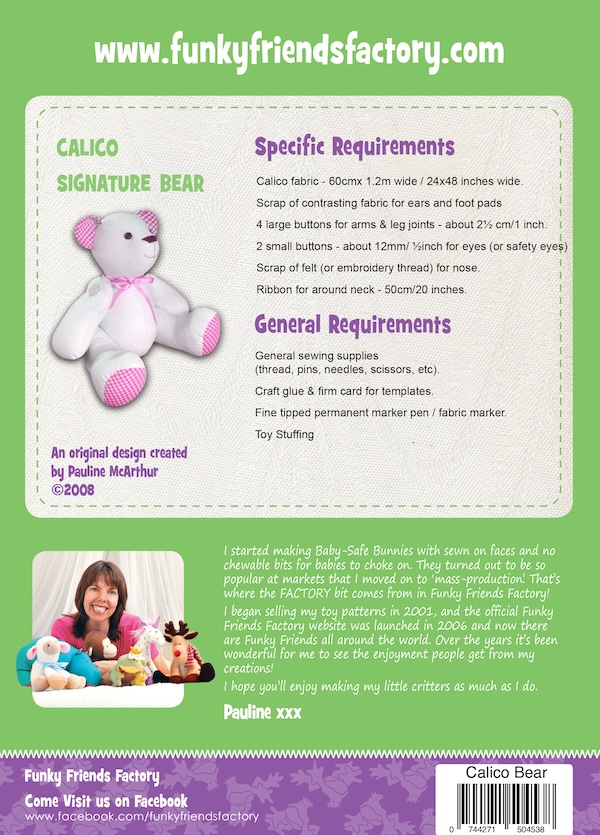 This chubby baby bear was designed for new sewers. He is easy to sew, with no complicated arm or leg joints. He sits up on his own and has a very wide, totally flat, single-piece tummy—perfect for displaying images from t-shirts or baby clothes. He also features a 12.5 cm (5 in) square grid on the tummy piece and a 10 cm (4 in) square grid on the foot pads, giving plenty of space for embroidery or names and dates.