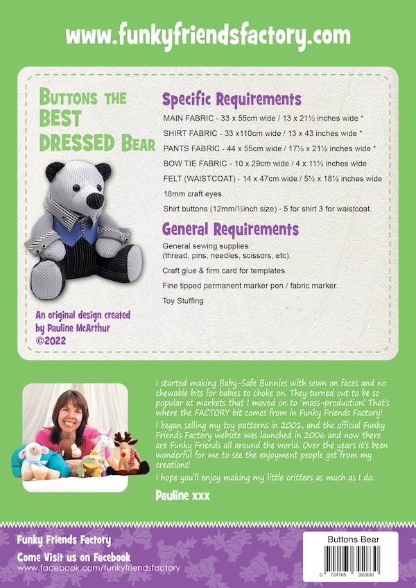 This non-jointed teddy bear features built-in shirt and trousers details plus a felt waistcoat, designed either for making a memory bear from pre-loved clothing, or for using new fabrics with collar, cuffs and bow tie pieces included.