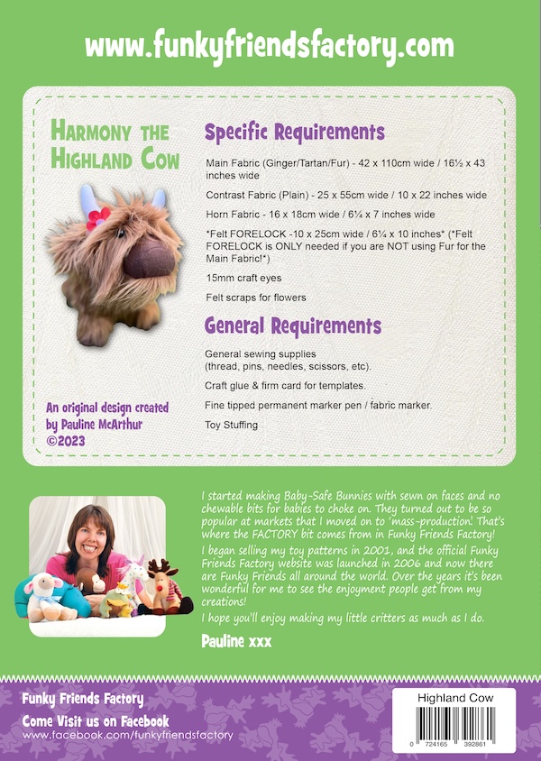 Harmony the Highland Cow (or ‘coo’) is happiest frolicking in the Scottish heather. Her sturdy body makes her a perfect toy for kids or a trendy décor item. You can sew Harmony in most fabrics—including quilting cottons, cuddle fabrics or even fake fur. A felt forelock pattern piece is included so you don’t need to use fur, and flower-crown pieces are included for optional embellishment.