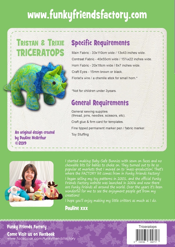 Timmy Triceratops is a cute and friendly dinosaur soft toy with all the classic triceratops features — a sturdy body, three little horns and a decorative frill that’s perfect for showing off bold prints or contrasting fabrics. He’s fun to sew and makes a great companion for dino-loving kids.