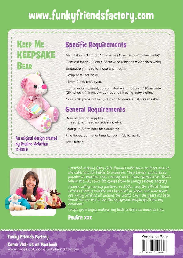 This baby-faced teddy bear is specifically designed for sewing lovely keepsakes. With a heart-shaped nose, cute up-turned muzzle, arms & legs sewn into the seams for easier construction, large flat areas for embroidery (tummy, back, arms & foot-pads) and a chubby bottom for extra "hugginess”, it’s perfect for marking a milestone, creating a memorial or sewing just for you!