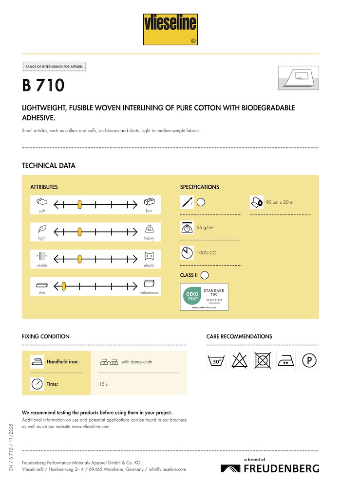 Especially soft and lightweight interlining for small parts as well as front parts of jackets etc. made of very lightweight to mediumweight outer fabrics. Use with Soft, flowing fabrics such as silk, viscose, acetate and cupro.Nonwoven made of synthetic fibres: 15% recycled PES