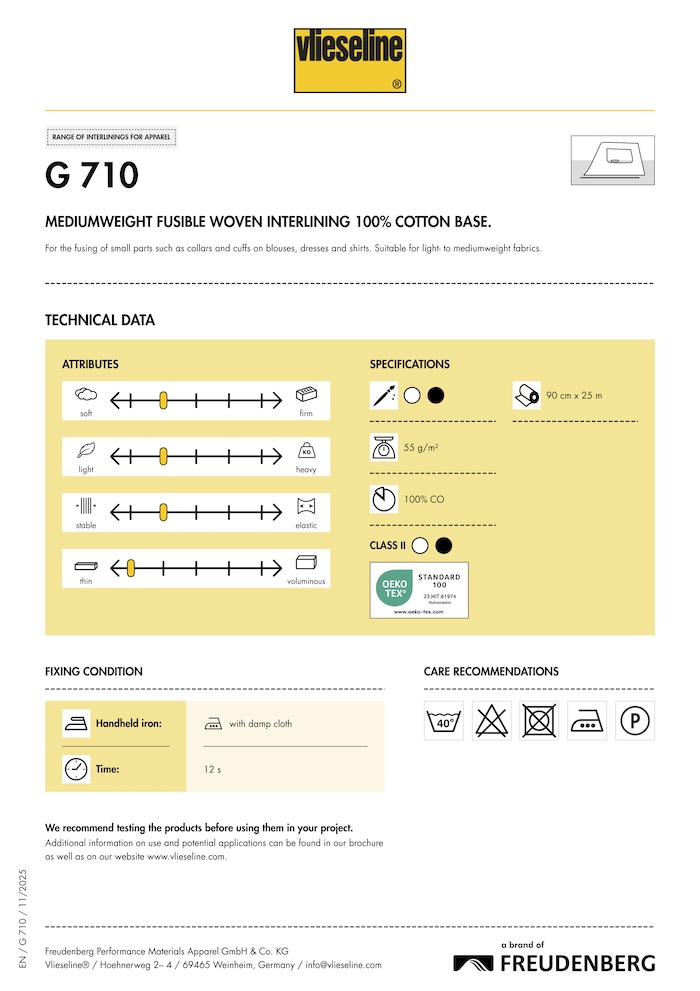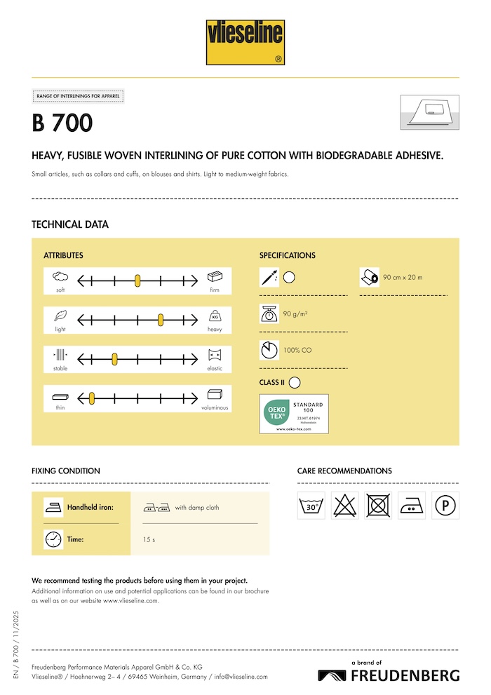 Versatile woven interlining for small parts of blouses and shirts. Lightweight to mediumweight fabrics. Machine wash 40 degrees