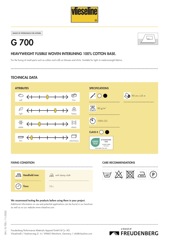 For the fusing of small parts and front parts on jackets and for handicrafts. Suitable for heavy-weight fabrics which are heat-sensitive and cannot be ironed. Machine washable at 60 degrees.