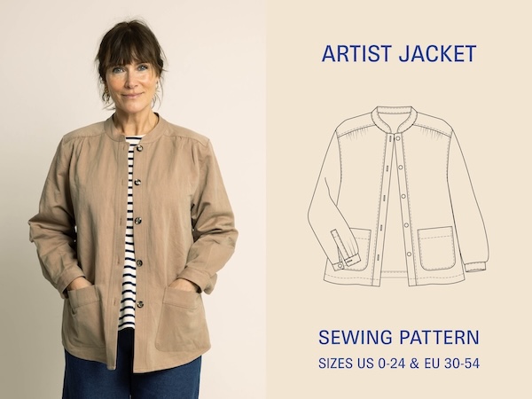 Artist Jacket Sewing Pattern is a relaxed functional workwear-inspired piece with dropped shoulders a front button placket large patch pockets and a minimalist banded collar.
