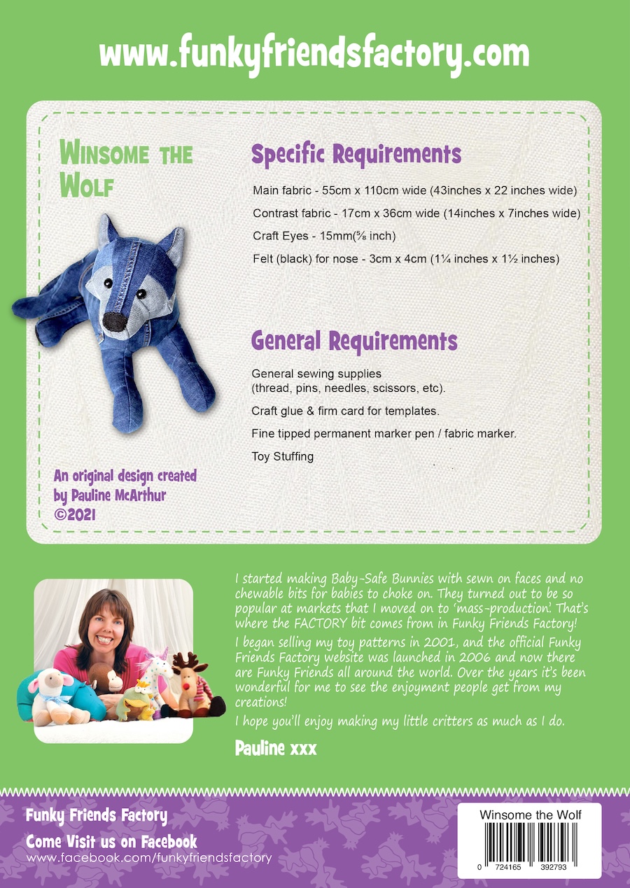 This striking wolf soft toy lies in a relaxed pose with legs out to one side, giving it a unique, expressive silhouette. With a sweet face and detailed shaping, it’s designed for confident makers ready to sew an impressive and memorable soft toy.